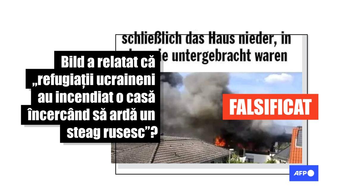 Zeci de utilizatori români de Facebook au distribuit o captură de ecran a ceea ce pare a fi un articol din tabloidul german (aici, aici, aici ) cu titlul „Refugiații ucraineni au vrut să ardă un steag rusesc, dar au ajuns să dea foc casei în care stăteau”. Titlul este însoțit de o fotografie a unei clădiri în flăcări.