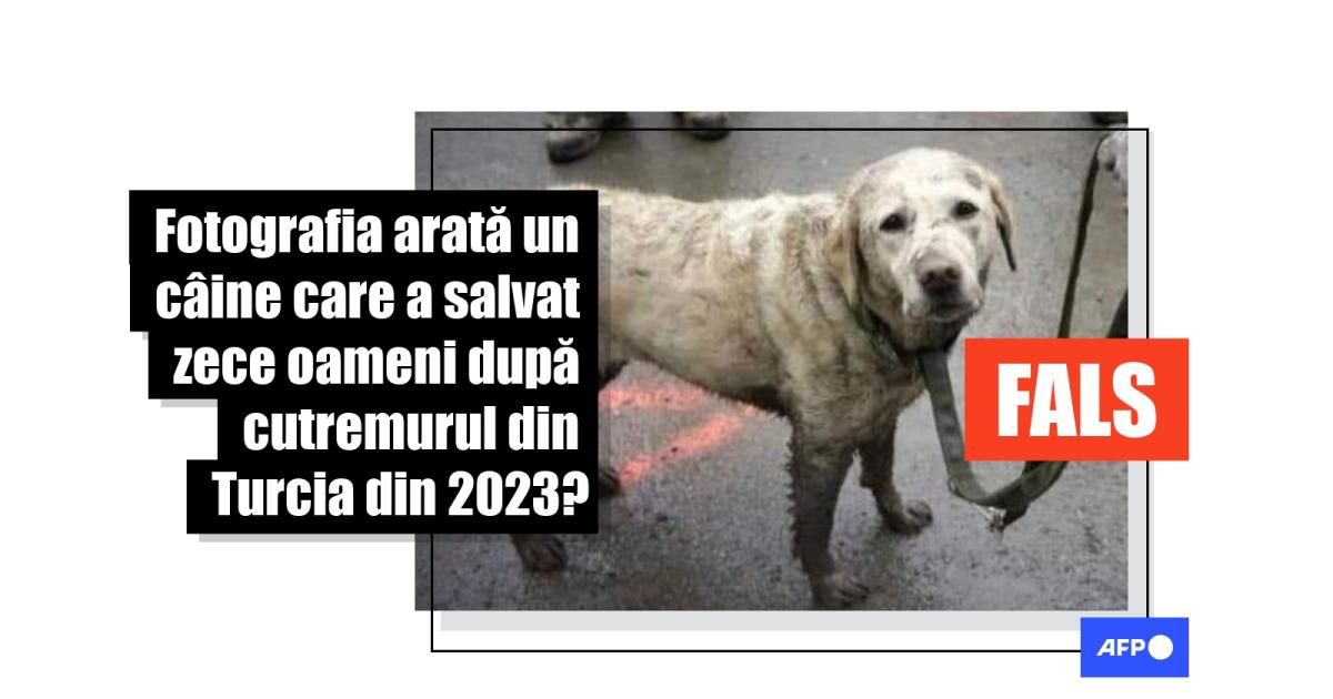 „Așa arată un câine salvator care a muncit 10 ore ca să scoată oamenii de sub dărâmături în Turcia”, spune această postare pe Facebook din 9 februarie 2023, distribuită de pe 220 de ori de atunci, care arată o poză cu un câine alb și murdar în lesă. Postări cu descrierei similare pot fi găsite aici sau aici.