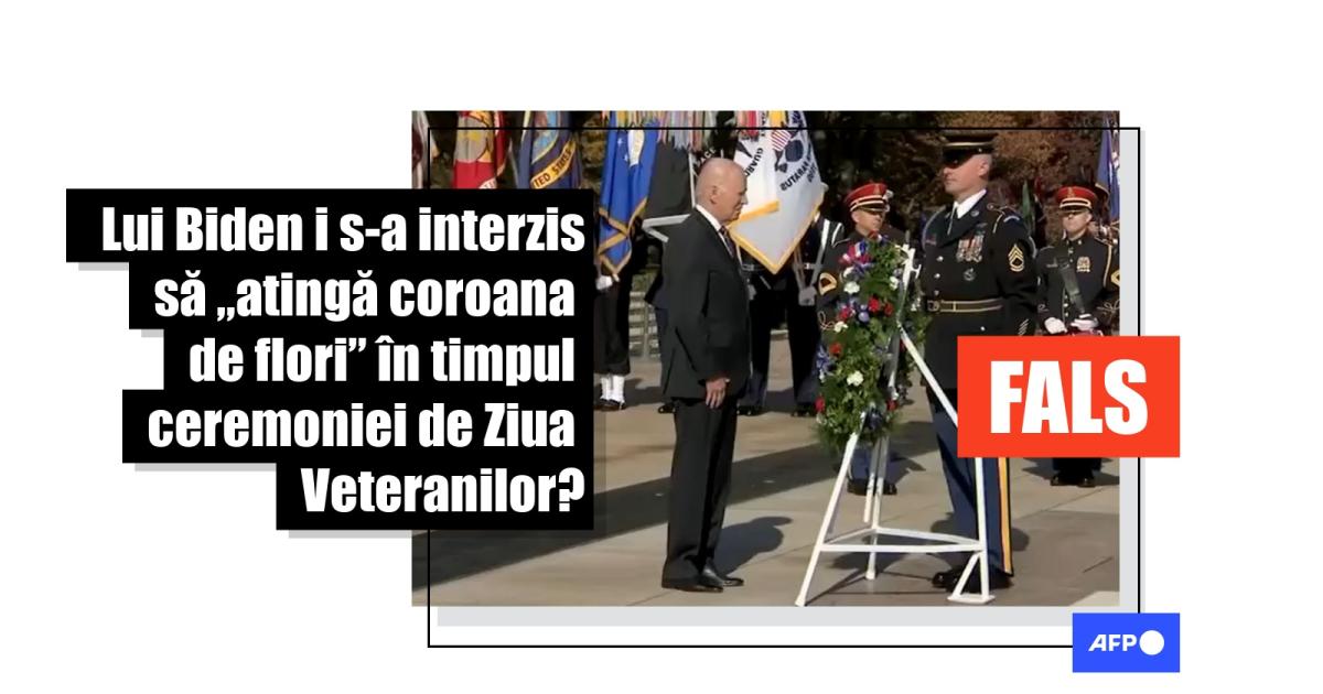 O postare pe Facebook din 12 noiembrie 2023 sugerează că, din cauza faptului că președintele american Joe Biden este „fals” sau slab, armata l-a împiedicat să atingă o coroană de flori în timpul unei ceremonii din 11 noiembrie 2023. Postarea include un scurt fragment video care îl arată pe Biden dezorientat, întorcându-se de mai multe ori în apropierea coroanei de flori până când un oficial militar îl ghidează spre poziția corectă. Postarea a fost distribuită de peste 140 de ori.