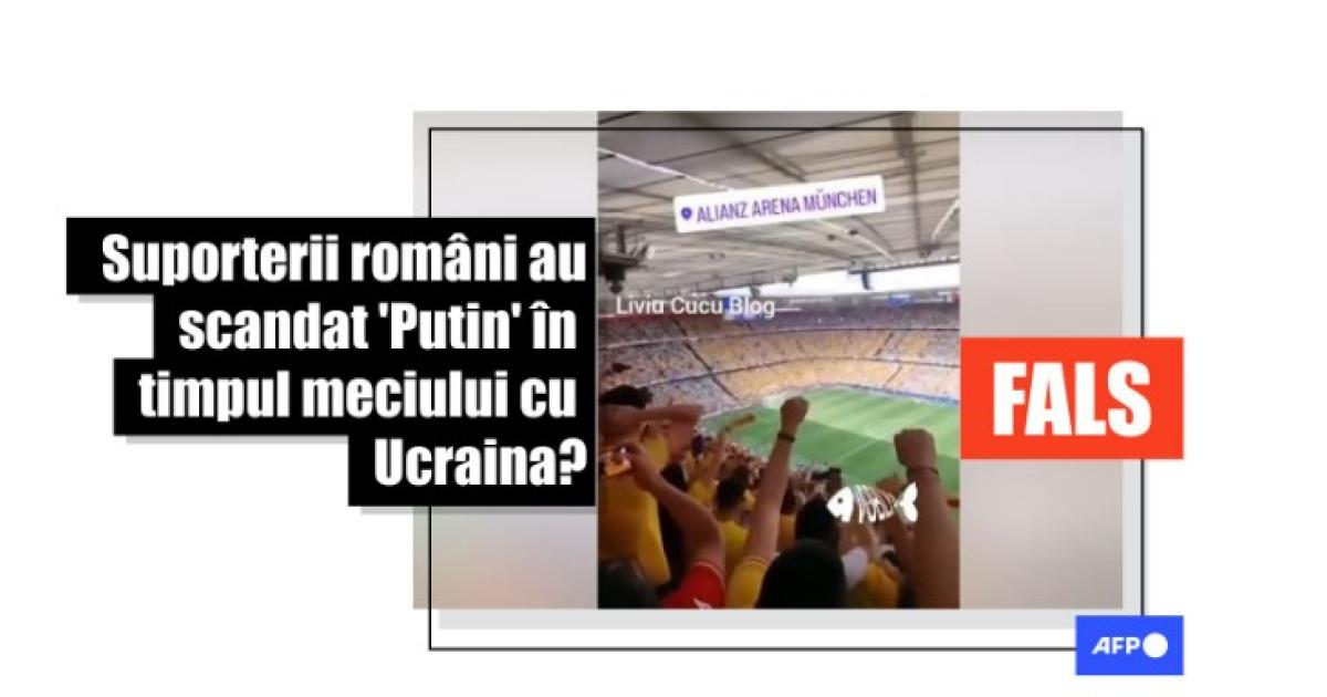 Dar videoclipul este manipulat: arată suporteri români (în tricouri galbene, culoarea echipei naționale, cu o bandă tricoloră albastru-galben-roșu pe mâneci) în timpul meciului România-Ucraina din 2024 de la Munchen, dar se pare că i s-au adăugat segmente din coloana sonoră a unui videoclip din 2021. Videoclipul din 2021 arăta inițial fanii ucraineni (îmbrăcați și ei în galben) insultându-l pe președintele rus în timpul unui meci la București. În transmisiunea în direct a meciului din 2024 nu există nicio urmă de scandări similare pro sau contra lui Putin. Nici fotografii și reporterii AFP care au relatat meciul nu au auzit astfel de scandări. La întrebarea AFP, organizatorul UEFA a răspuns că videoclipul care s-a răspândit online este un fals.