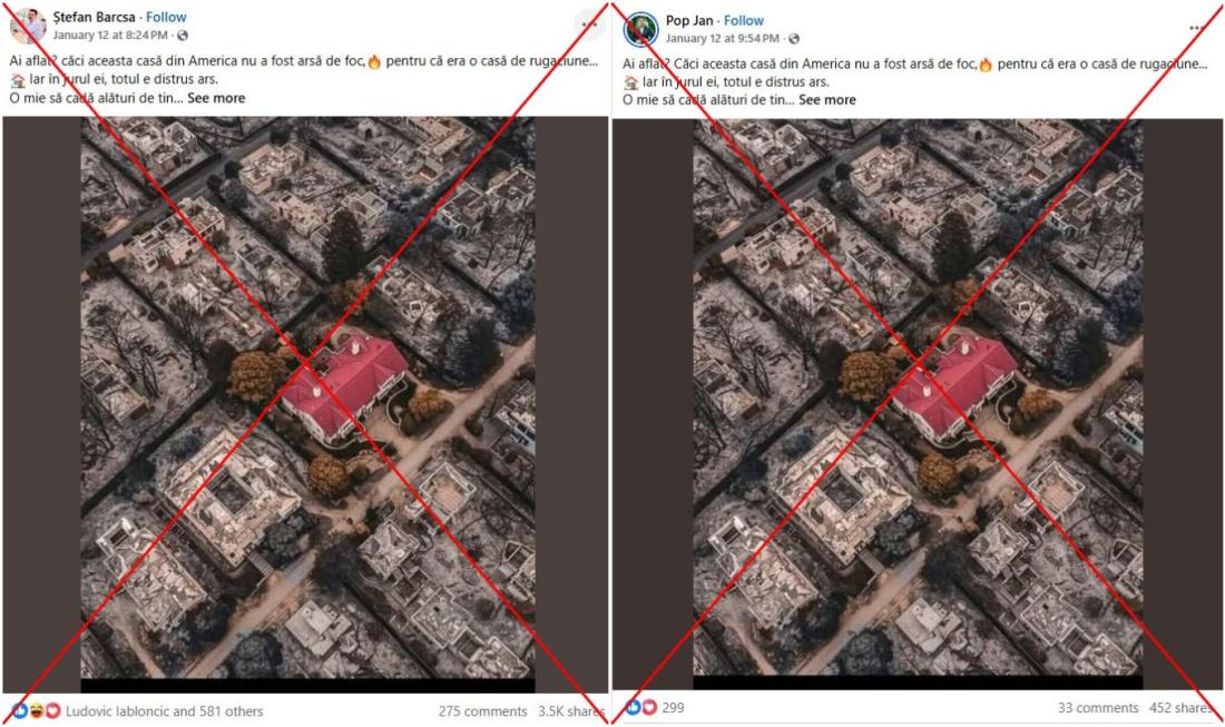 „Ai aflat? căci aceasta casă din America nu a fost arsă de foc, pentru că era o casă de rugaciune... Iar în jurul ei, totul e distrus ars”, spune o postare pe Facebook din 12 ianuarie 2025, distribuită de peste 3.500 de ori până acum.