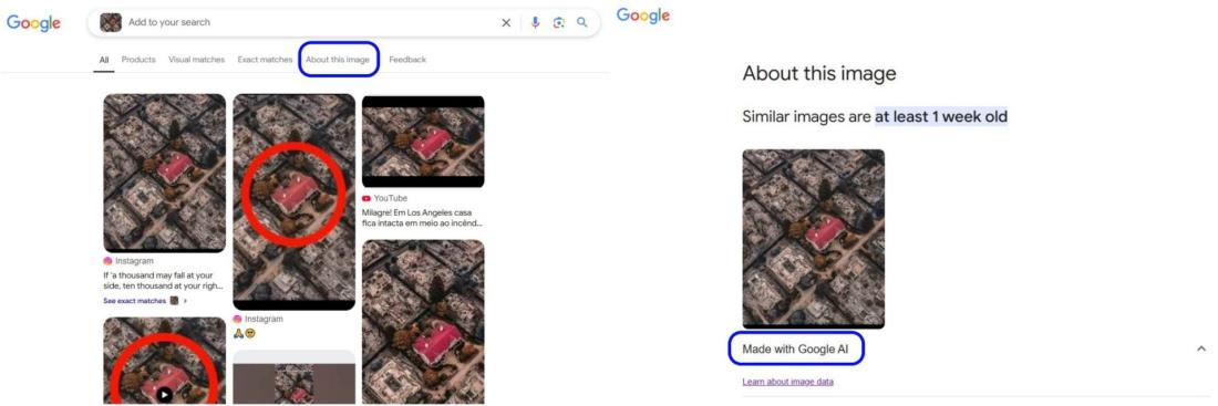 Când efectuăm o căutare inversă a imaginii pe Google Images și accesăm fila „Despre această imagine” („About this image”), apare eticheta „creată cu Google AI” („created with Google AI”).