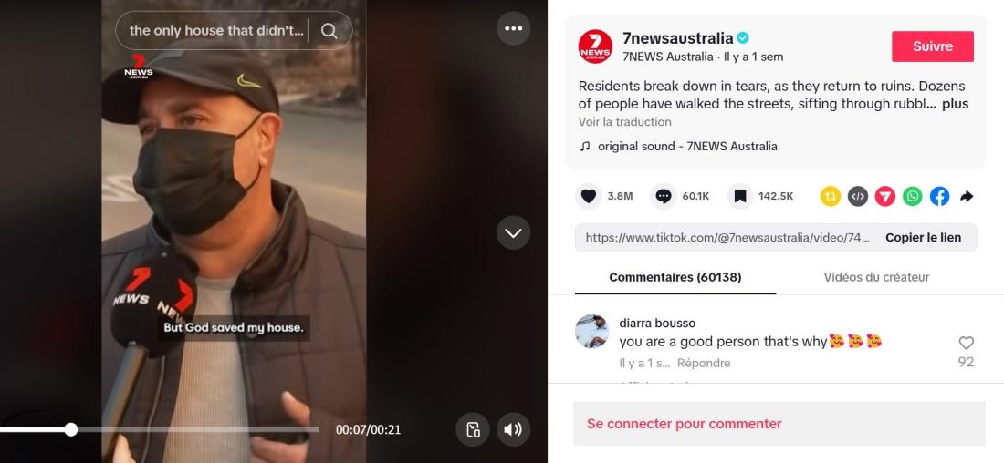 În mod similar, publicația australiană 7NEWS Australia, urmărită pe scară largă pe rețelele sociale, a distribuit un scurt interviu cu un bărbat identificat drept proprietarul unei case care a supraviețuit incendiilor din Los Angeles (arhivat aici).