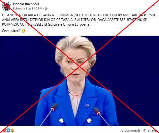 „UE anunță crearea organizației numită 'Scutul Democratic European' care va permite anularea rezultatelor din orice țară ale alegerilor, dacă aceste rezultate nu se potrivesc cu interesele ei (adică ale Uniunii Europene)”, scrie o postare pe Facebook din 8 februarie 2025.