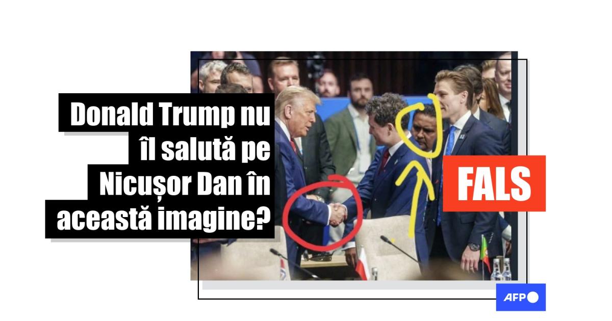 La scurt timp după summitul NATO desfășurat la Haga în iunie 2025, utilizatorii rețelelor sociale au distribuit o fotografie în care președintele României, Nicușor Dan, dă mâna cu președintele SUA, Donald Trump, însoțită de o afirmație falsă potrivit căreia mass-media locală ar fi interpretat greșit acest gest. Adnotarea de pe postări sugera în mod nefondat că Trump era fotografiat strângând mâna unui bărbat care stătea lângă Dan. Cu toate acestea, o analiză mai atentă a fotografiei originale arată că cei doi lideri își strângeau mâna, fapt confirmat și de fotografiile și filmările oficiale ale evenimentului.