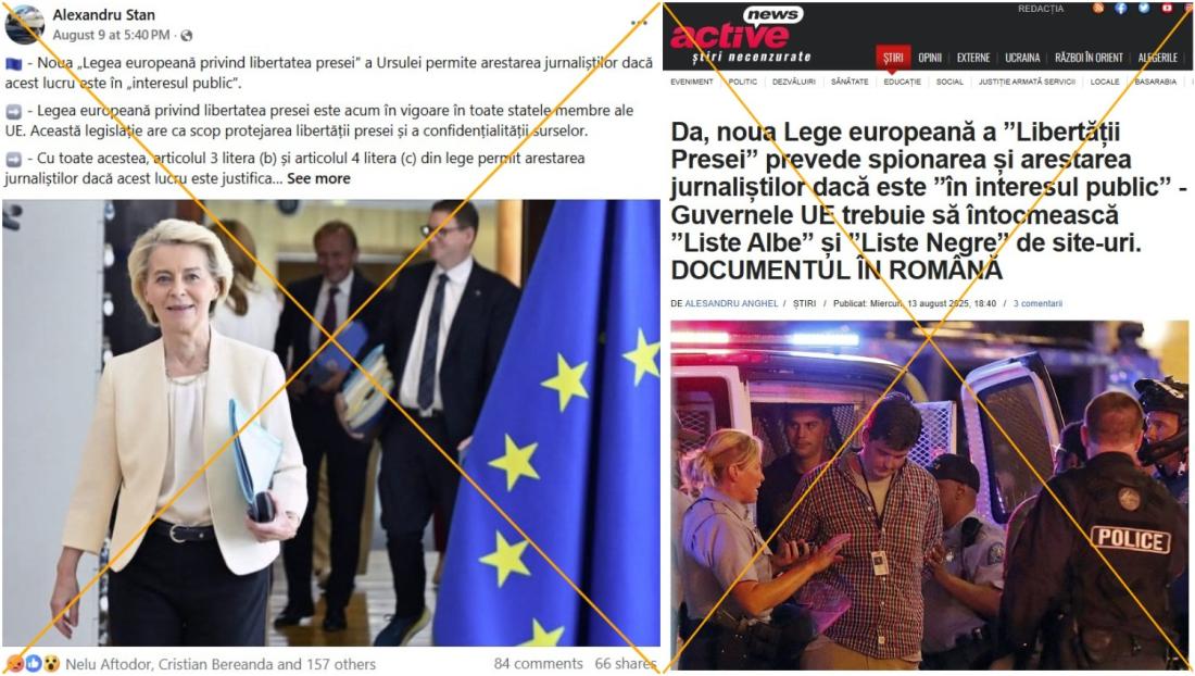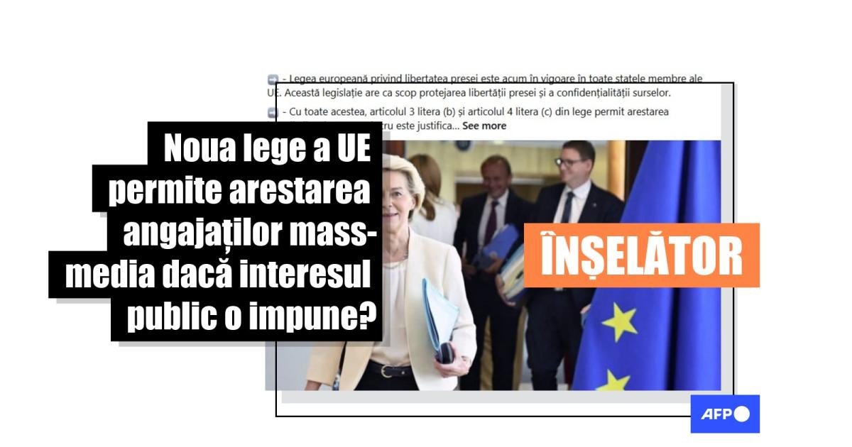 „Noua 'Legea europeană privind libertatea presei' a Ursulei (președinta Comisiei Europene Ursula von der Leyen – n. red.) permite arestarea jurnaliștilor dacă acest lucru este în 'interesul public'”, scrie o postare pe Facebook în limba română din 9 august 2025, distribuită de peste 60 de ori. Postări similare pot fi găsite aici și aici.