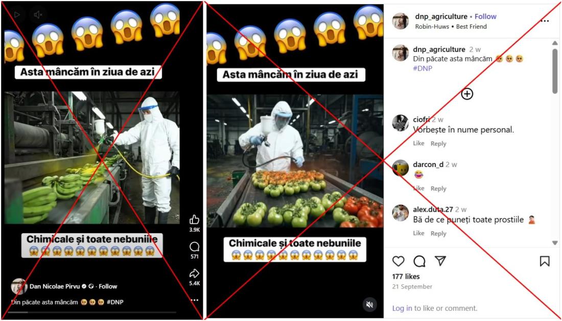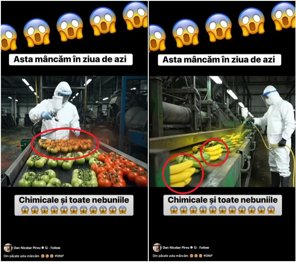 „Din păcate, asta mâncăm”, spune descrierea aceluiași videoclip publicat pe Facebook și Instagram pe 21 septembrie 2025, distribuit în total de peste 5.500 de ori. „Substanțe chimice și tot felul de prostii”, se poate citi în textul suprapus peste imagini.
