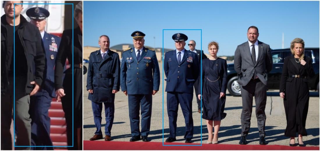 Lângă ea se află un colonel din Forțele Aeriene ale SUA, a cărui identitate a fost confirmată de biroul AFP din Washington D.C. Același bărbat poate fi văzut și în fundalul altor cadre, precum și într-o fotografie oficială publicată de biroul președintelui ucrainean.