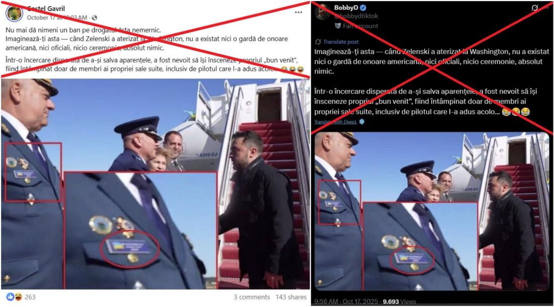 „Imaginează-ți asta — când Zelenski a aterizat la Washington, nu a existat nicio gardă de onoare americană, nici oficiali, nicio ceremonie, absolut nimic. Într-o încercare disperată de a-și salva aparențele, a fost nevoit să își însceneze propriul „bun venit”, fiind întâmpinat doar de membri ai propriei sale suite, inclusiv de pilotul care l-a adus acolo...”, spune această postare pe Facebook din 17 octombrie 2025, distribuită de peste 140 de ori.