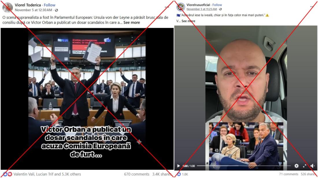 Mai multe alte postări, publicate la începutul lunii noiembrie 2025 și distribuite de mii de ori între timp, au reluat același text (spre exemplu aici, aici, aici). Unele dintre ele (aici,aici, aici) au inclus și o fotografie care pretinde să surprindă momentul în care Orban ridică un dosar în plenul Parlamentului European, în timp ce Ursula von der Leyen pare surprinsă lângă el.