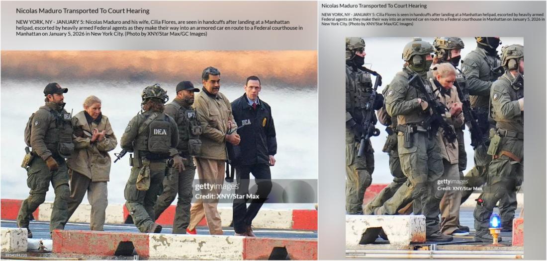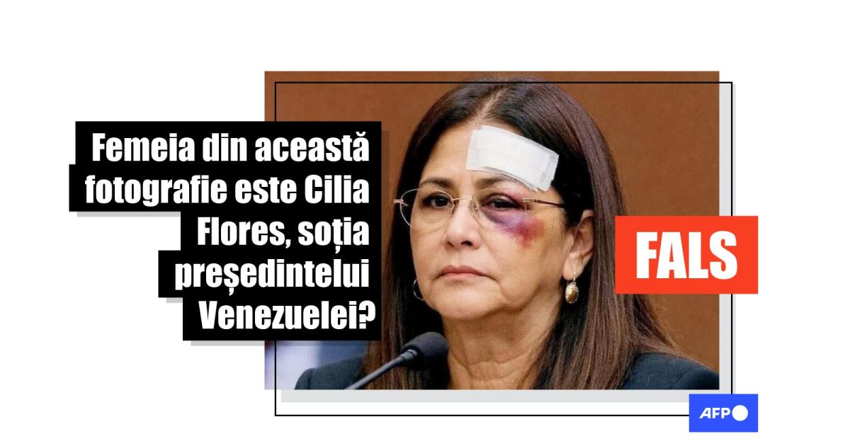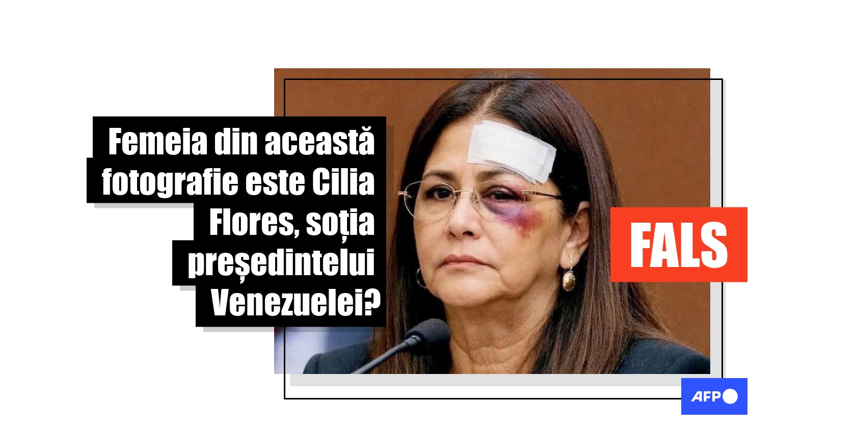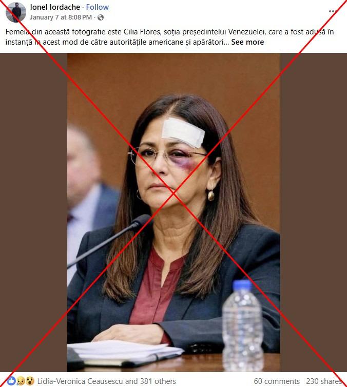 După ce au fost capturați de forțele speciale americane, președintele destituit al Venezuelei, Nicolas Maduro, și soția sa, Cilia Flores, au apărut în fața unui tribunal din New York pe 5 ianuarie 2026, unde au pledat nevinovați la multiple capete de acuzare. La scurt timp după aceea, o imagine care circula pe rețelele sociale în mai multe limbi pretindea că o arată pe Flores în instanță cu un ochi vânăt și fruntea bandajată. Însă, deși Flores a fost văzută în instanță cu bandaje pe față, aceasta nu este o fotografie autentică. Schițele din sala de judecată, fotografiile și videoclipurile din presă din acea zi o arată pe Flores cu păr blond și purtând o ținută diferită. Imaginea virală a fost probabil generată cu ajutorul inteligenței artificiale.