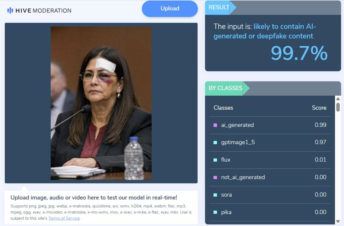 Instrumentul de detectare AI al Hive Moderation a indicat că imaginea are o probabilitate de 99,7% să „conțină conținut generat de AI sau deepfake”.