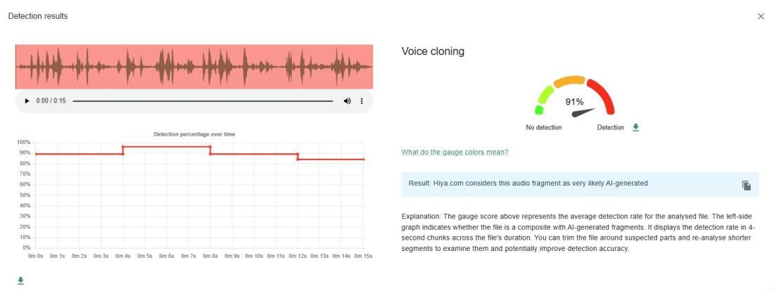 Un rezultat similar a fost obținut în urma unei investigații efectuate cu Deepfake Total, o altă aplicație pentru detectarea pistelor audio generate de AI, dezvoltată de Institutul Fraunhofer pentru Securitate Aplicată și Integrată. Aceasta a indicat o probabilitate de 99,9% ca pista audio să fie generată de AI.