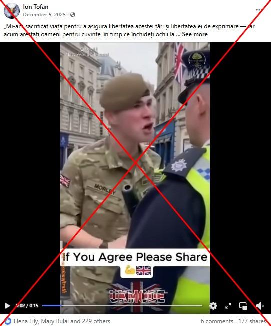 „UN SOLDAT BRITANIC VORBEȘTE ÎN NUMELE UNOR MILIOANE. Mi-am sacrificat viața pentru a asigura libertatea acestei țări și libertatea ei de exprimare — iar acum arestați oameni pentru cuvintele lor, în timp ce închideți ochii la crimele comise de invadatori. Sunteți o rușine pentru uniforma voastră și o insultă la adresa mea”, spun mai multe postări pe Facebook din 5 decembrie 2025 (aici, aici), care includ un clip de 15 secunde și au fost distribuite de peste 250 de ori. În aceasta, putem vedea un tânăr soldat care gesticulează cu degetul arătător ridicat în timp ce strigă la un polițist care pare nemișcat.
