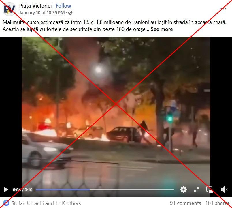 „Mai multe surse estimează că între 1,5 și 1,8 milioane de iranieni au ieșit în stradă în această seară. Aceștia se luptă cu forțele de securitate din peste 180 de orașe și 512 locații din toate cele 31 de provincii. Protestele pot fi acum numite oficial o revoluție”, a scris un utilizator pe Facebook pe 10 ianuarie 2026, într-o postare care însoțește un videoclip ce arată o revoltă violentă și mașini în flăcări.