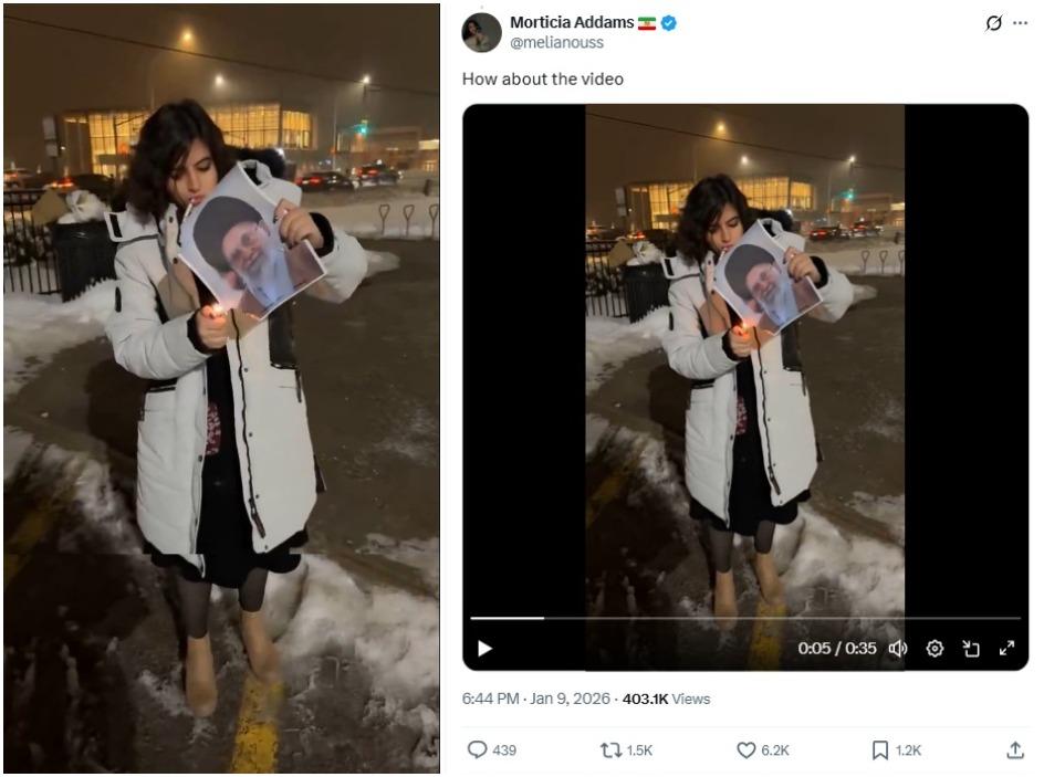 Postarea distribuie o captură de ecran a unui videoclip în care o femeie aprinde o țigară în fața unei fotografii a liderului suprem al Iranului, ayatollahul Ali Khamenei. Apoi aruncă fotografia pe jos și îi arată degetul mijlociu, într-un gest de sfidare.