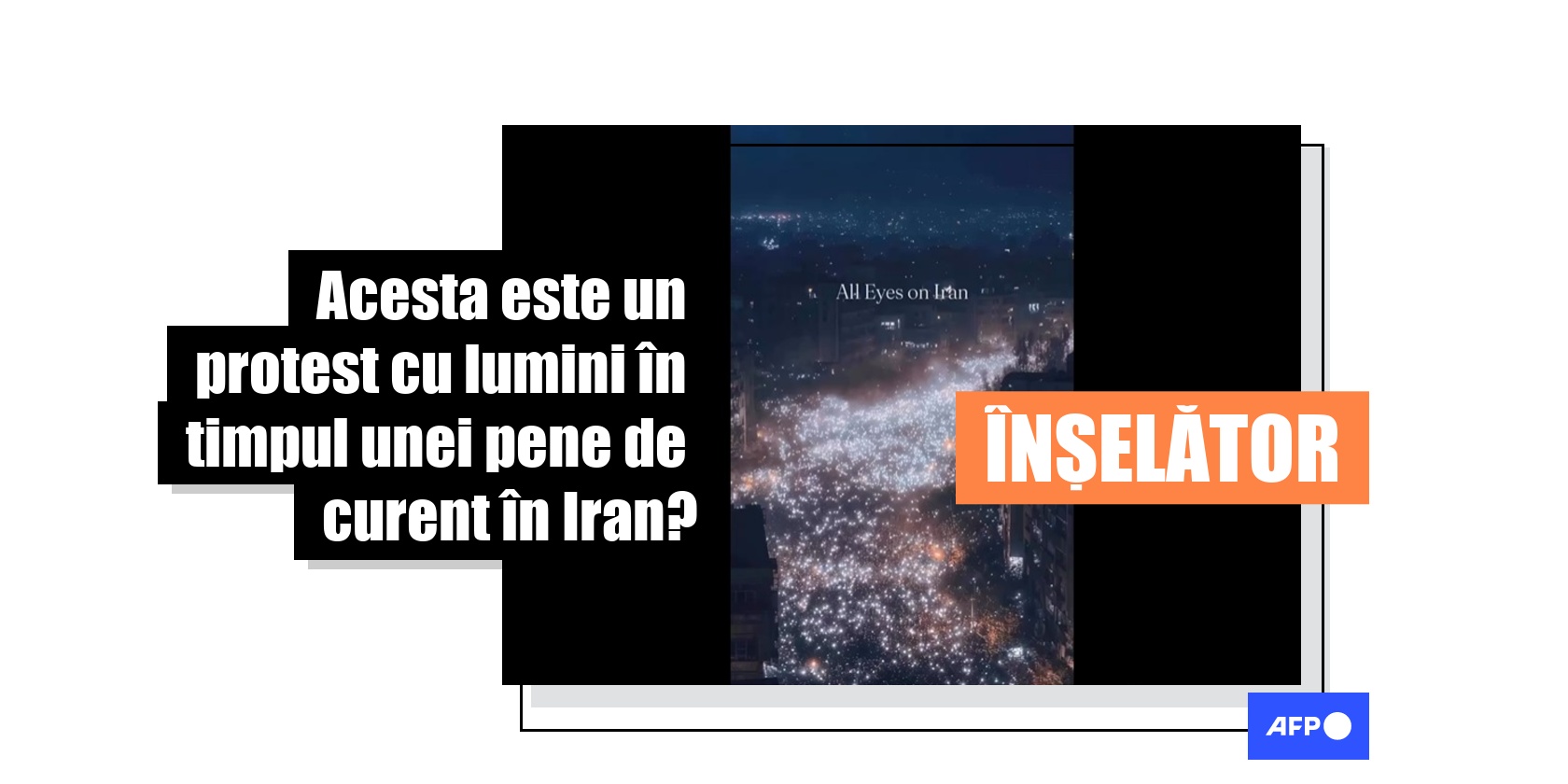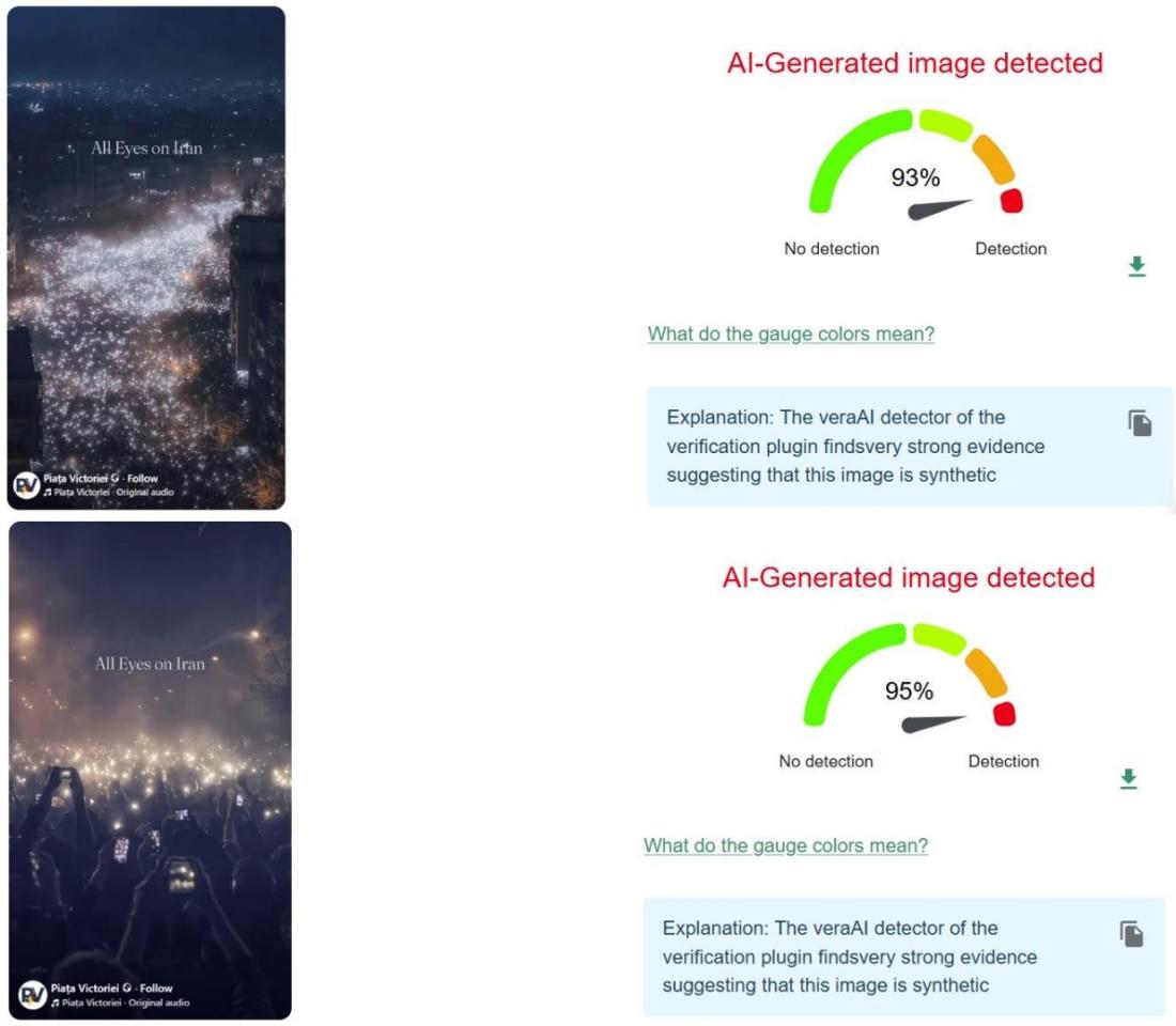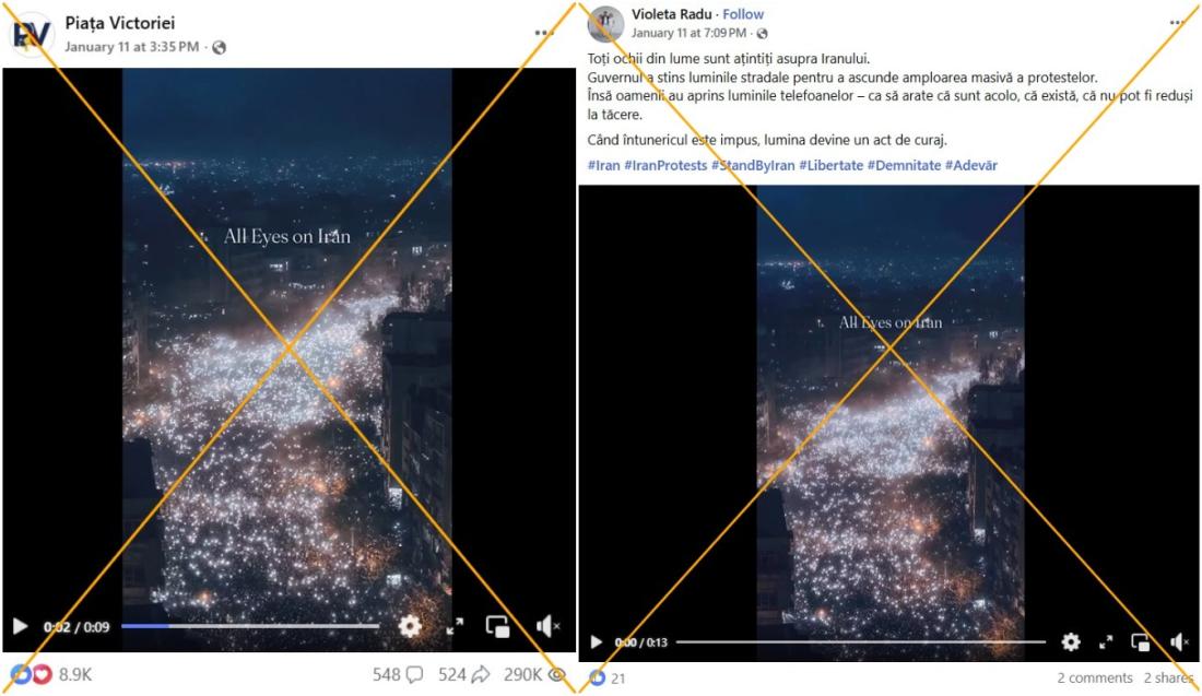 În contextul unei valuri de proteste masive la nivel național în ianuarie 2026, autoritățile iraniene au blocat accesul cetățenilor la internet. Utilizatorii rețelelor sociale au distribuit ulterior un videoclip care pare să arate protestatarii folosind telefoanele mobile pentru a lumina strada în timp ce mărșăluiau ca răspuns la o presupusă întrerupere a curentului electric. Cu toate acestea, AFP a identificat mai multe neconcordanțe vizuale care arată că filmarea a fost creată folosind inteligența artificială (IA) și a confirmat acest lucru cu autorul original al videoclipului.