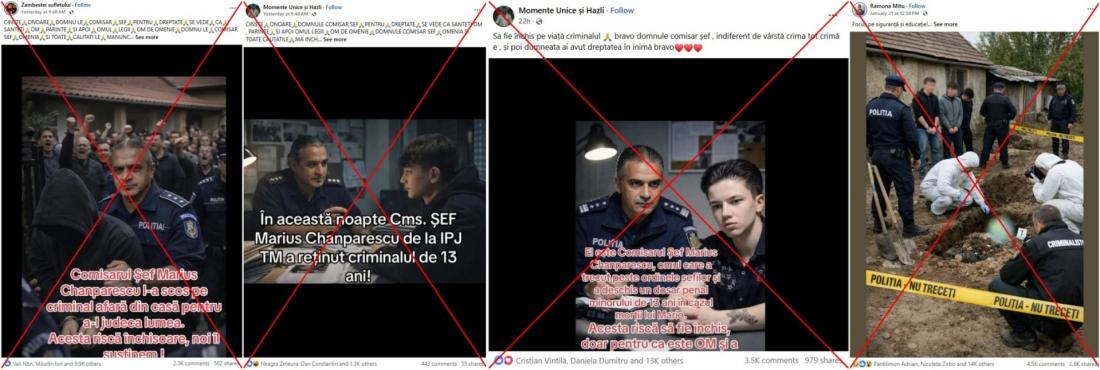 O altă imagine arată un polițist în uniformă așezat la un birou, în fața unui adolescent cu părul închis la culoare. Textul suprapus afirmă: „În această noapte, Cms. Șef Marius Chanparescu de la IPJ TM a rețiut criminalul de 13 ani!”.