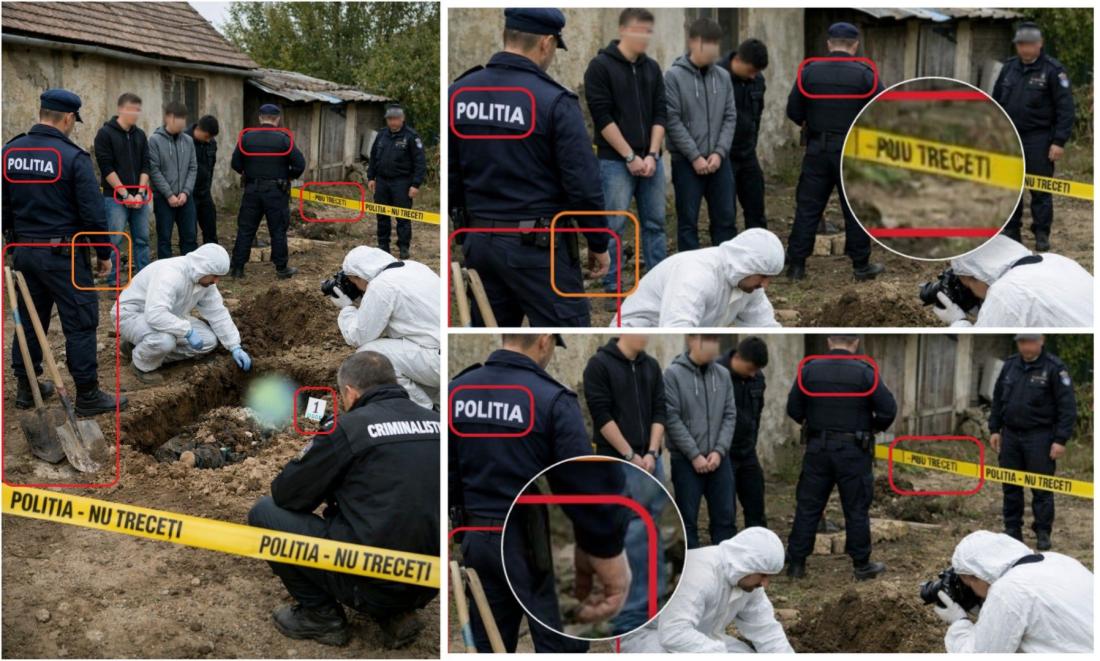 În plus, unul dintre indivizii prezentați drept suspect pare să poarte două ceasuri de mână, câte unul pe fiecare braț. Cele două lopeți vizibile în scenă par, de asemenea, nesprijinite, nefiind rezemate de sol sau de vreun obiect. Marcajul de probă numerotat „1” este poziționat nefiresc, având mai multe cercuri sub el care nu au o semnificație coerentă.