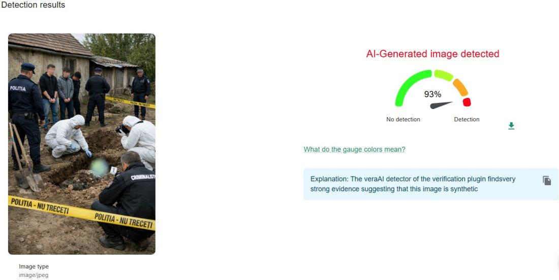 O analiză realizată cu ajutorul instrumentului InVID-WeVerify a semnalat și ea o probabilitate ridicată ca imaginea să fie generată artificial, cu un scor de 93%.