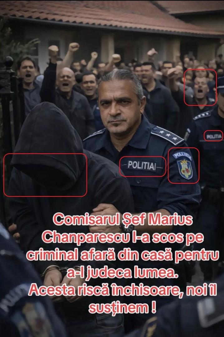 Aceasta includea o imagine în care se vedea un polițist în uniformă escortând o persoană îmbrăcată într-un hanorac negru cu glugă, înconjurată de o mulțime furioasă cu pumnii ridicați. Un text suprapus în limba română afirma: „Comisarul șef Marius Chanparescu l-a scos pe criminal afară din casă pentru a-l judecat lumea. Acesta riscă închisoare, noi îl susținem.”
