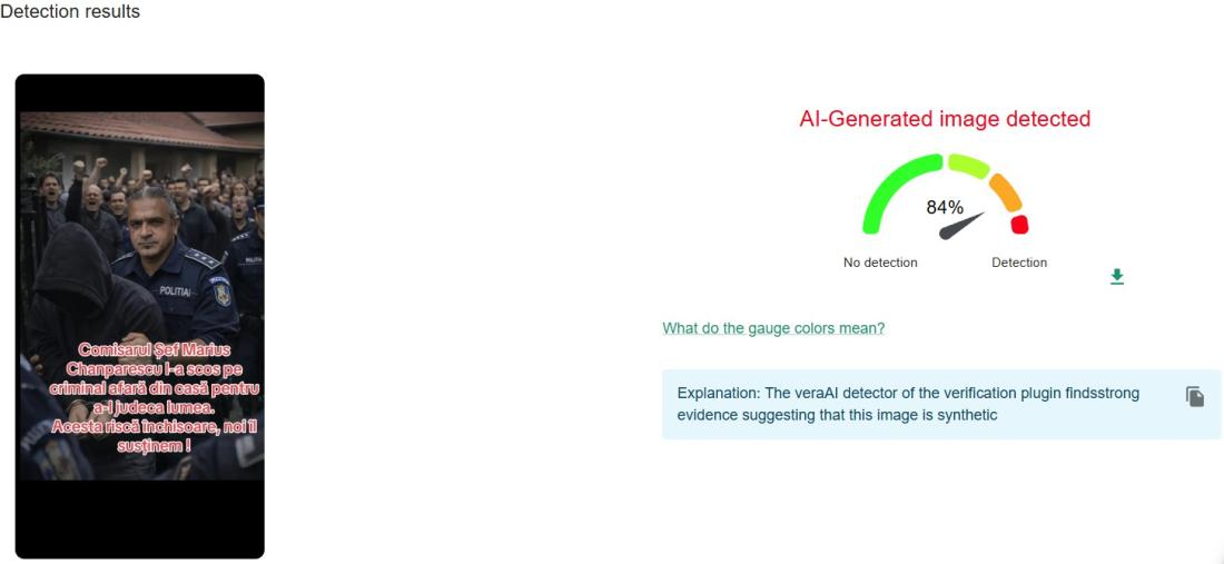 O analiză realizată cu ajutorul instrumentului InVID-WeVerify, dezvoltat în colaborare cu AFP, a indicat că imaginea este foarte probabil generată artificial, cu un scor de 84%.
