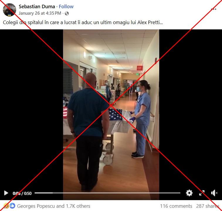 În Minneapolis și în restul Statelelor Unite au avut loc veghe și omagii în memoria asistentului medical de terapie intensivă Alex Pretti, după ce acesta a fost împușcat mortal de agenții de imigrare, dar un videoclip în care se vede o targă acoperită cu un steag fiind transportată pe holul unui spital nu are nicio legătură cu acest eveniment. Spitalul de veterani la care lucra Pretti a declarat că imaginile nu au fost filmate în incinta sa, iar elementele vizuale indică faptul că imaginile datează probabil din perioada pandemiei de Covid-19.