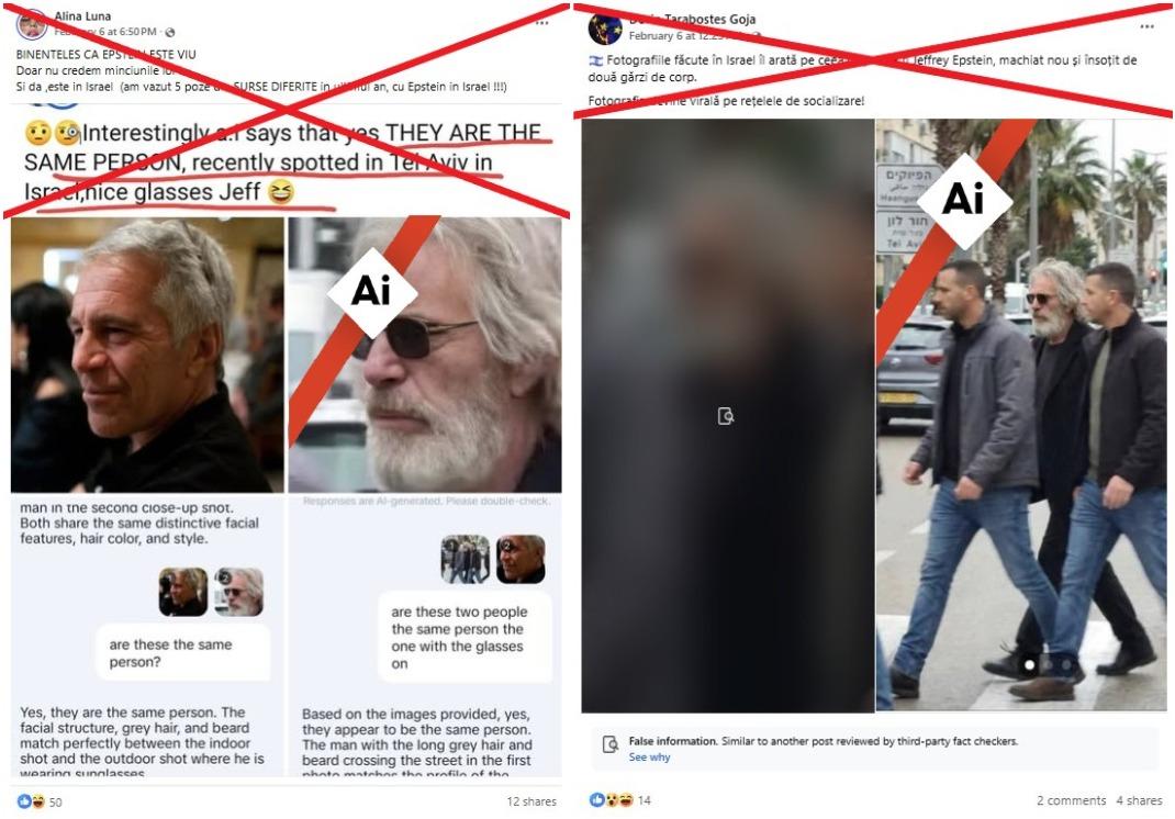 „Bineînțeles că Epstein este viu. Doar nu credem minciunele lor. Și da, este în Israel (am văzut 5 poze din surse diferite în ultimul an, cu Epstein în Israel!!!)”, spune această postare pe Facebook din 5 februarie 2026, care a distribuit fotografia. Postări similare pot fi văzute aici sau aici.