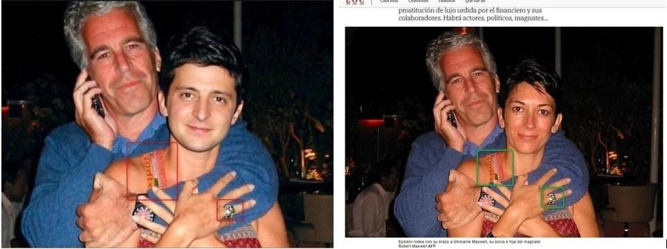 O căutare inversă pe Google a fotografiei a dus la mai multe articole de presă (aici, aici, aici) care includ o imagine în care Epstein apare alături de fosta sa parteneră, Ghislaine Maxwell. Fotografia arată același inel și aceeași bretea a rochiei pe umăr.