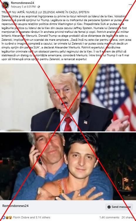 „TRUMP NU IARTĂ: NUMELE LUI ZELENSKI APARE ÎN CAZUL EPSTEIN”, scriu parțial mai multe postări pe Facebook publicate între 6 și 9 februarie, unele dintre ele fiind distribuite de mii de ori de atunci (aici, aici sau aici). Postările includ o imagine care pretinde că îl arată pe Epstein îmbrățișând un tânăr care seamănă cu Zelenski.