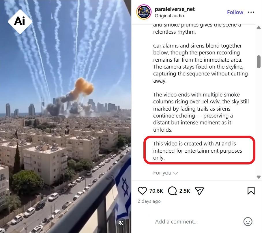 Postarea include un avertisment care precizează că videoclipul a fost „creat cu AI și este destinat doar în scopuri de divertisment”. Descrierea care însoțește postarea prezintă o scenă fictivă detaliată despre lovituri cu rachete asupra Tel Avivului, sugerând că imaginile au fost concepute ca un conținut sintetic, nu pentru a documenta un eveniment real. Textul descrierii pare redactat într-un mod care amintește de un „prompt”, adică un tip de instrucțiune textuală pe care un utilizator o introduce într-un generator AI pentru a crea conținut foto sau video.
