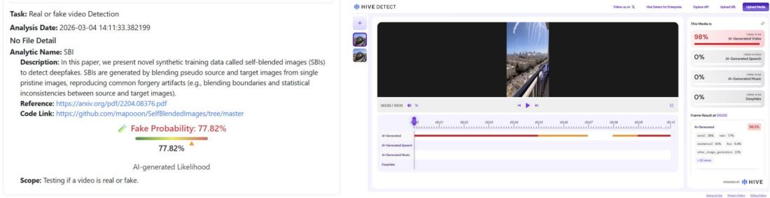 Testele realizate cu modelul DeepFake-O-Meter pentru detectarea compozițiilor de imagini sintetice, dezvoltat de Media Forensics Lab de la University at Buffalo, precum și analiza videoclipului pe platforma Hive Moderation, au indicat de asemenea o probabilitate ridicată ca acesta să fi fost generat cu AI.