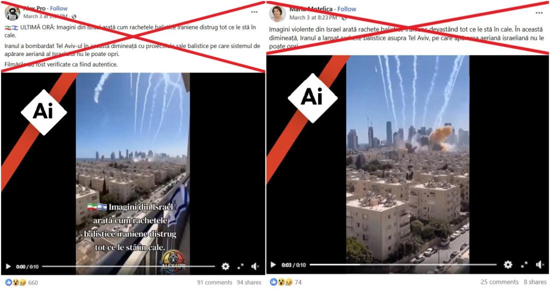 Atacurile aeriene masive israeliano-americane care au vizat Iranul la sfârșitul lunii februarie 2026 au declanșat un război regional în Orientul Mijlociu, țara vizată ripostând prin lansarea de rachete asupra Israelului, dar și asupra statelor din Golf care găzduiesc baze americane. În acest context, un videoclip viral care pretinde că ar arăta o serie de lovituri cu rachete asupra orașului israelian Tel Aviv a adunat milioane de vizualizări online. În realitate însă, clipul a fost generat cu ajutorul inteligenței artificiale, iar evenimentul pe care pretinde că îl arată nu a avut loc.