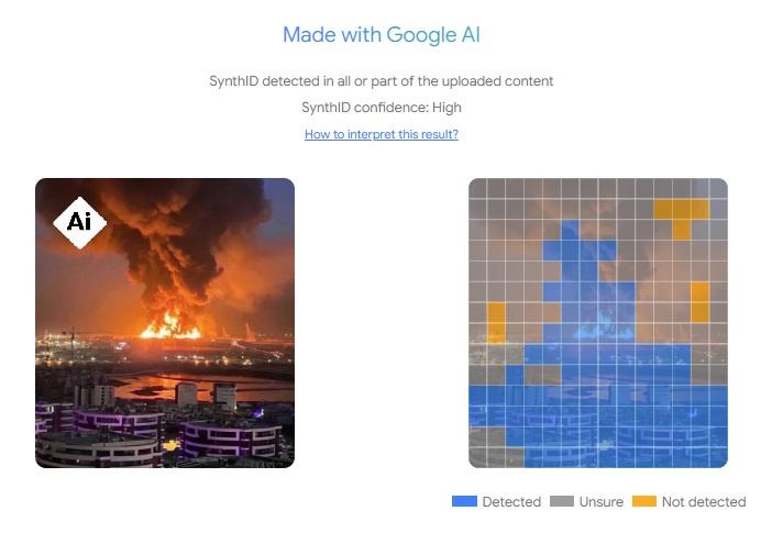 Acest lucru este confirmat și prin utilizarea instrumentului de detectare a filigranului SynthID, care identifică conținut produs de inteligența artificială a Google.