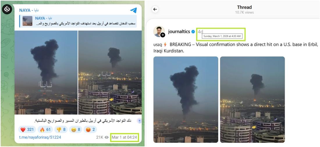 Pe Telegram, mesajul în arabă menționează „bombardarea prezenței americane din Erbil cu drone și rachete balistice”, în timp ce postarea în limba engleză de pe Threads susține că oferă „confirmare vizuală” a unui „impact direct asupra unei baze americane din Erbil, Kurdistanul irakian”.
