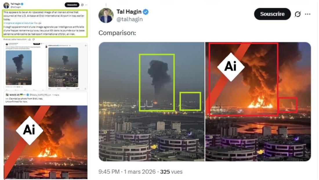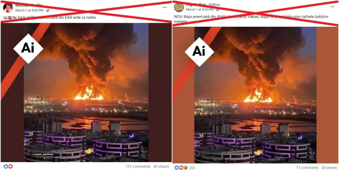 Explozii puternice au fost auzite la începutul lunii martie 2026 în apropierea aeroportului din Erbil, în Irak, care găzduiește trupe ale coaliției anti-jihadiste conduse de Statele Unite. În urma acestora, utilizatori de internet au distribuit o imagine care ar arăta un „incendiu violent” la o bază americană din zonă. Deși un jurnalist AFP a confirmat că a auzit explozii puternice și a văzut fum negru gros ridicându-se din zona aeroportului, această imagine specifică este înșelătoare: ea a fost modificată cu ajutorul inteligenței artificiale (AI) pentru a exagera amploarea pagubelor.