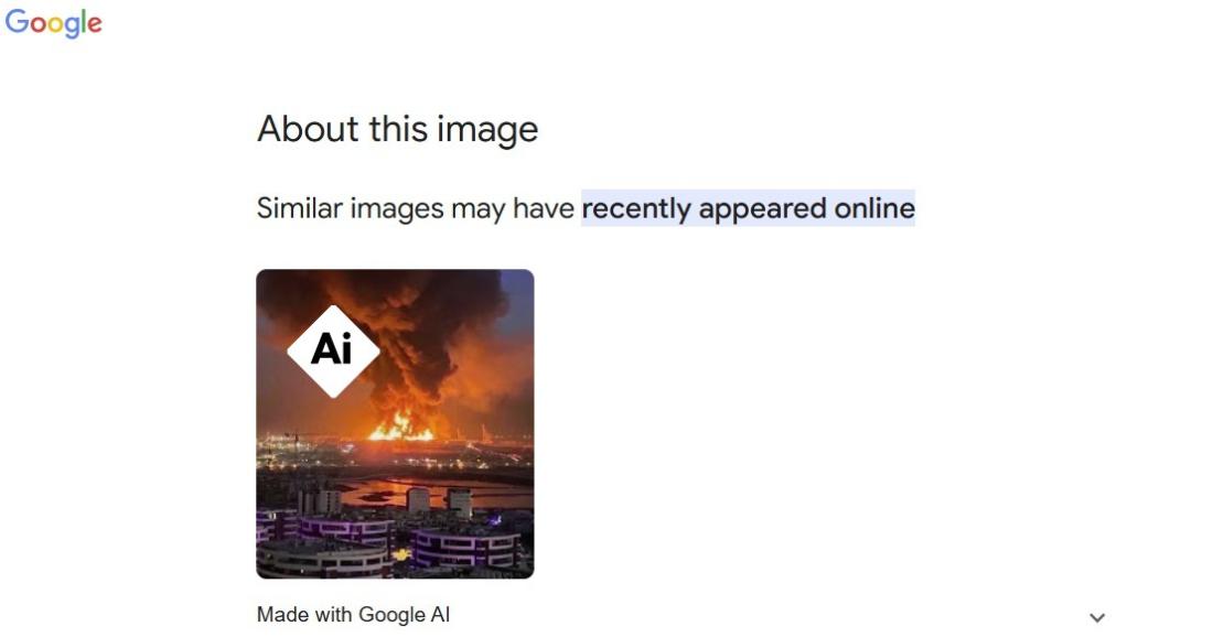 O căutare inversă a imaginii pe Google și consultarea secțiunii „About this image” indică faptul că imaginea a fost „creată cu Google AI”.