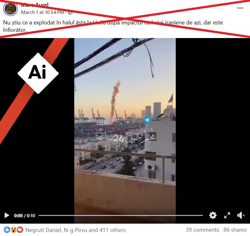 „Nu știu ce a explodat în halul ăsta la Haifa după impactul rachetei iraniene de azi, dar este înfiorător”, spune o postare pe Facebook din 2 martie 2026, care a adunat zeci de distribuiri. Postarea conține un videoclip de 10 secunde al unei presupuse explozii uriașe în port.