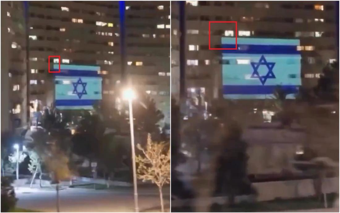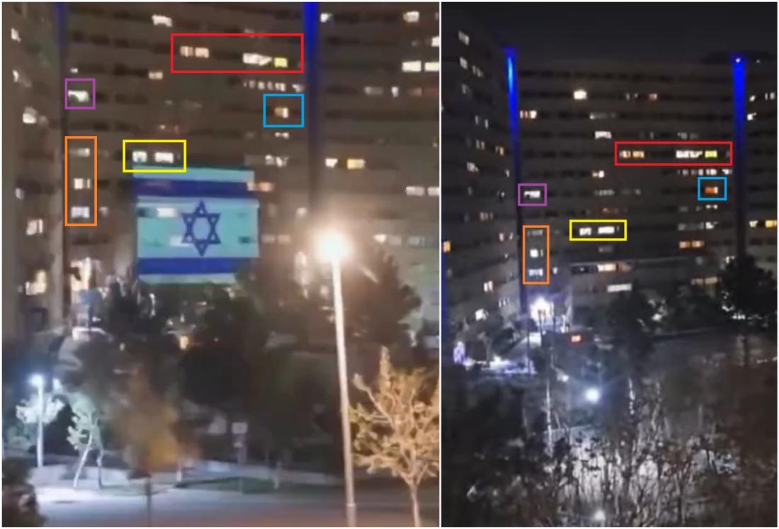 Se pot observa aceleași lumini la ferestrele apartamentelor și se aud fluierături distinctive în jurul minutului 1 și 10 secunde, care coincid cu sunetul din clipul viral cu steagul israelian.