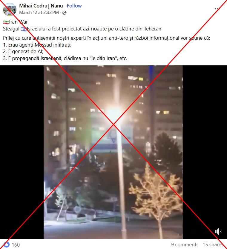„Steagul Israelului a fost proiectat azi-noapte pe o clădire din Teheran”, spune această postare de pe Facebook din 12 martie, 2026. „Un steag israelian a fost proiectat pe o clădire din #Ekbatan, #Teheran, ca un mesaj de recunoștință. Iranienii își riscă viața pentru a-și face auzită vocea în fața represiunii occidentale”, spune o altă postare din aceeași zi.