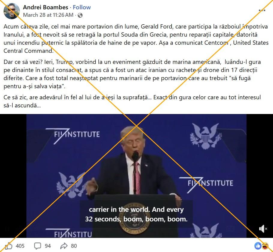 „Acum câteva zile, cel mai mare portavion din lume, Gerald Ford, care participa la războiul împotriva Iranului, a fost nevoit să se retragă la portul Souda din Grecia, pentru reparații capitale, datorită unui incendiu puternic la spălătoria de haine de pe vapor. Așa a comunicat Centcom , United States Central Command”, scrie această postare pe Facebook din 28 martie 2026.