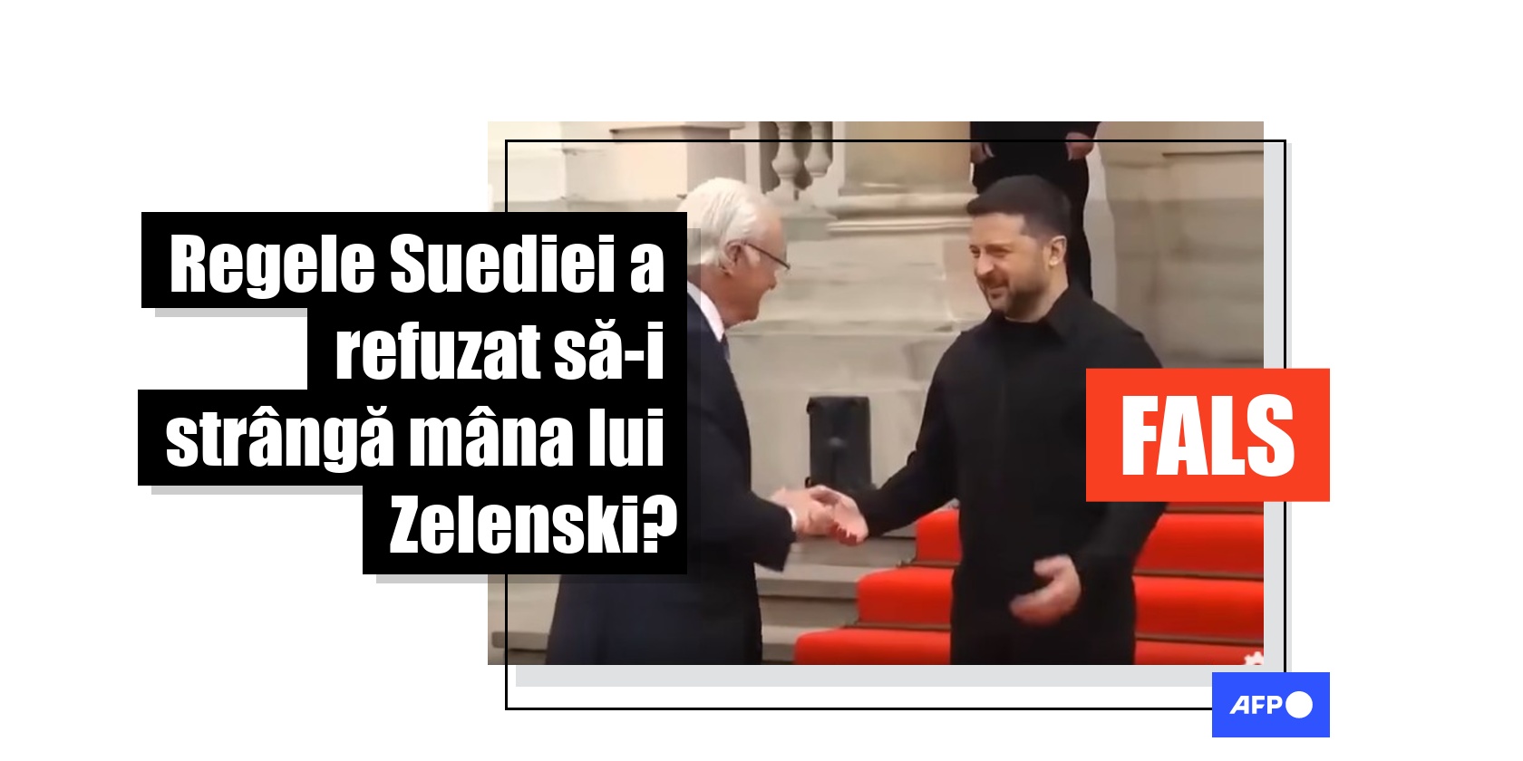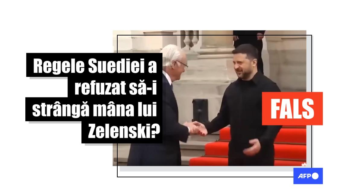Casa Regală suedeză a infirmat afirmația falsă potrivit căreia regele Suediei nu l-ar fi salutat pe Zelenski cu o strângere de mână, într-o declarație adresată postului public de televiziune suedez SVT pe 18 aprilie 2026. Raportul menționează o postare de pe X a postului de televiziune de stat rus Russia Today (RT). AFP a identificat videoclipul, care este disponibil aici. De asemenea, am constatat că o parte din logo-ul RT este vizibilă în videoclipurile distribuite pe rețelele de socializare.