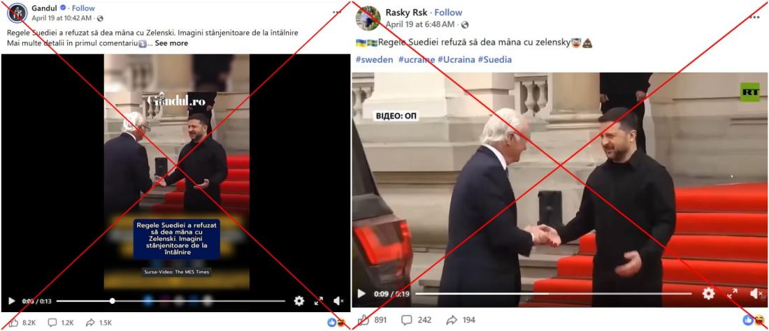 O temă populară și recurentă pe rețelele de socializare pro-ruse este afirmația că președintele ucrainean Volodimir Zelenski este ignorat de politicieni de seamă și de șefi de stat. În acest context, a circulat un videoclip care ar arăta că regele Suediei, Carl XVI Gustaf, ar fi refuzat să-i strângă mâna lui Zelenski în timpul unei vizite în orașul ucrainean Lviv, în aprilie 2026. Imaginile au fost însă manipulate și editate. Fotografiile și videoclipurile AFP de la fața locului arată clar că cei doi bărbați și-au strâns mâinile.
